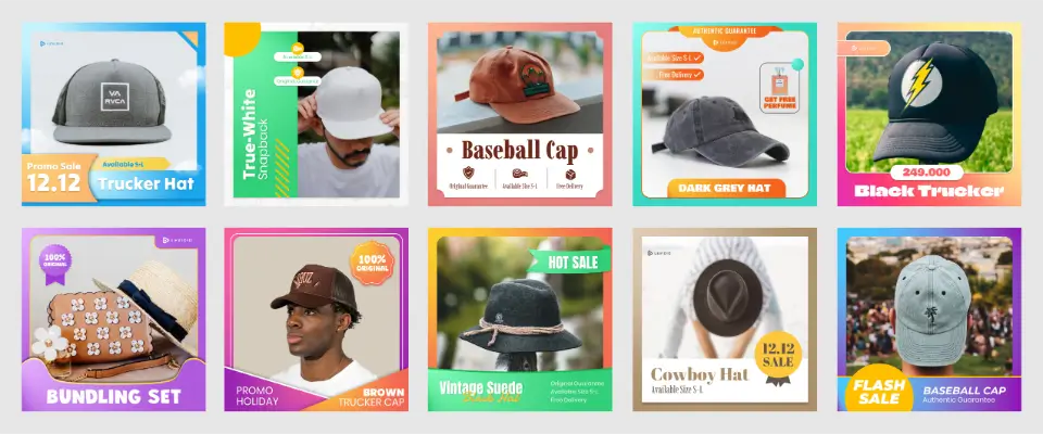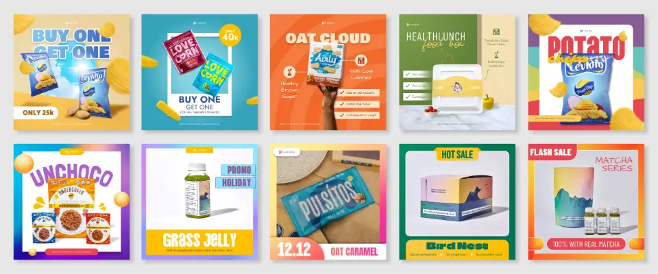 Animated and static banners for promotions on social media platforms, available in sizes 1:1, 4:5, 16:9, and 9:16.